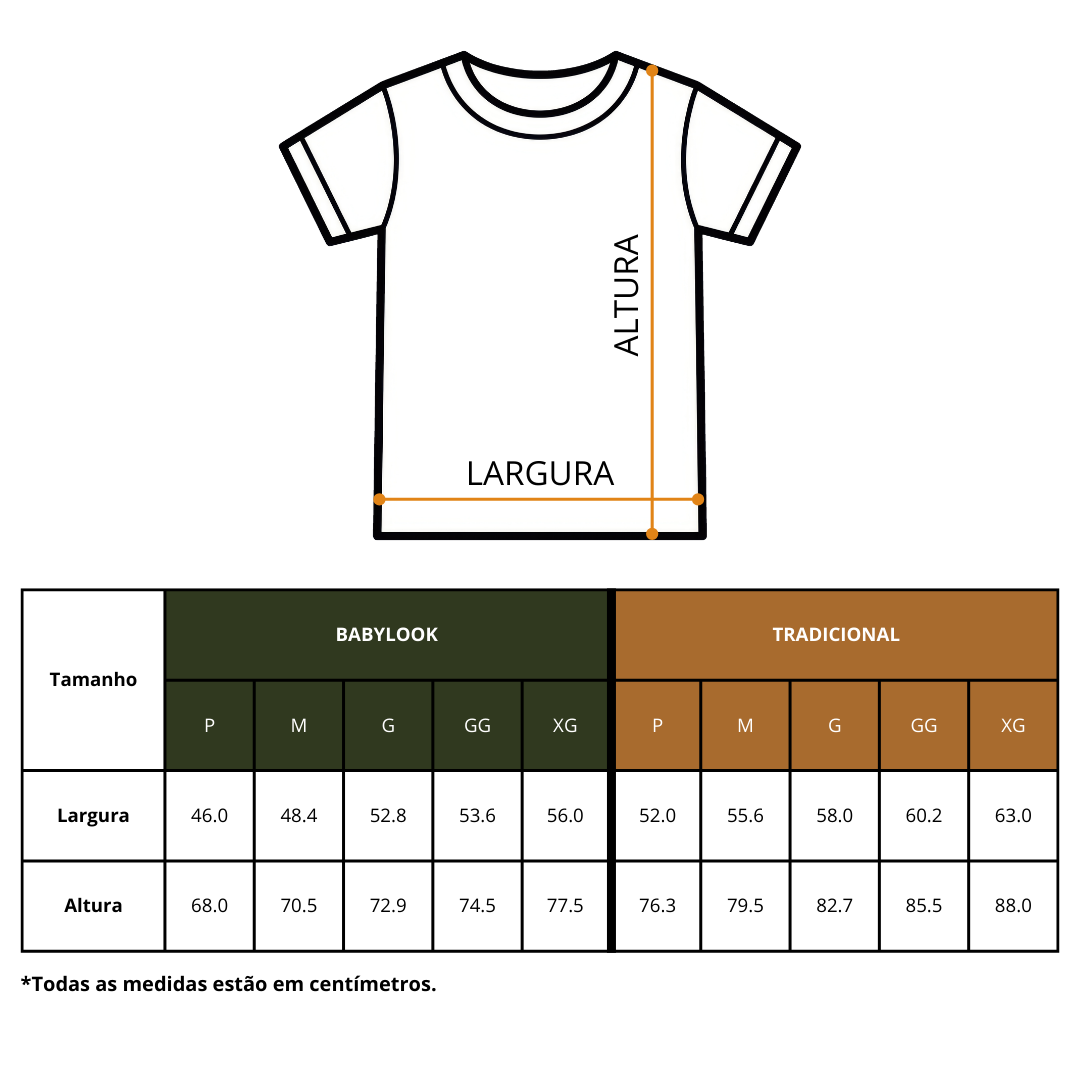 Analise as medidas abaixo e descubra a camiseta ideal para você: